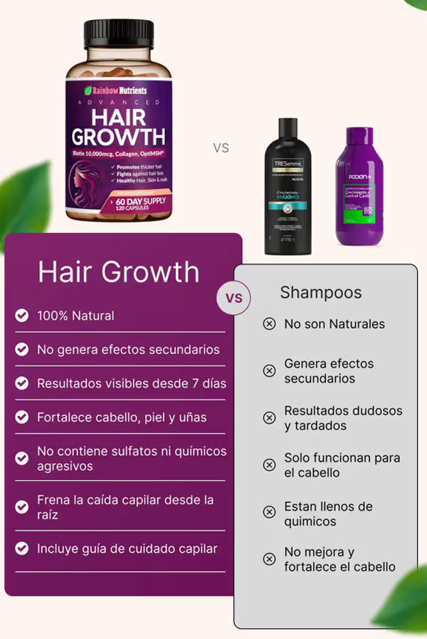 Con Hair Growth® Vitamina para Cabello con Biotina descubrirás una fórmula diseñada especialmente para revitalizar, fortalecer y embellecer tu cabello desde su raíz.